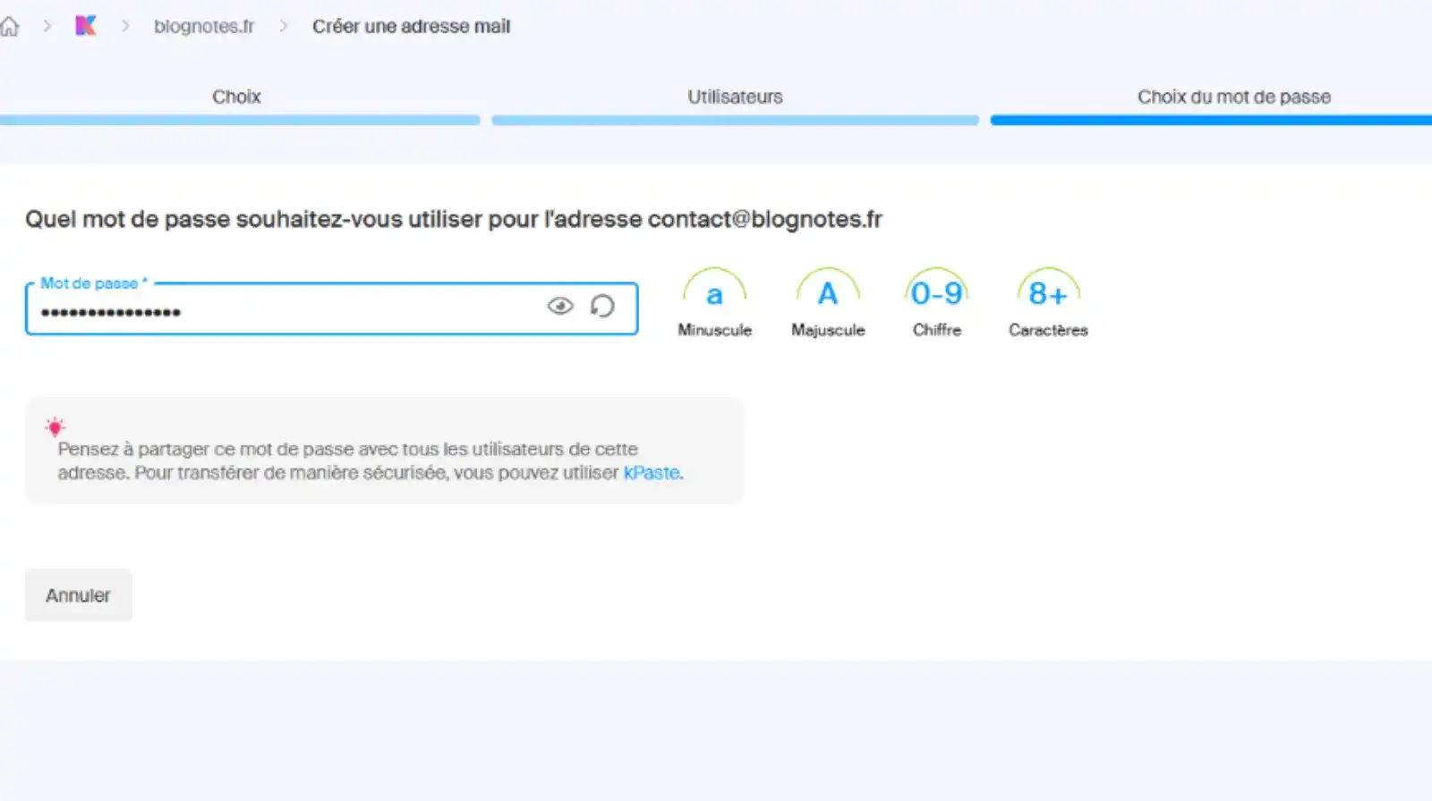 5. Créer le mot de passe pour cette adresse courriel et Validez votre adresse est prête.