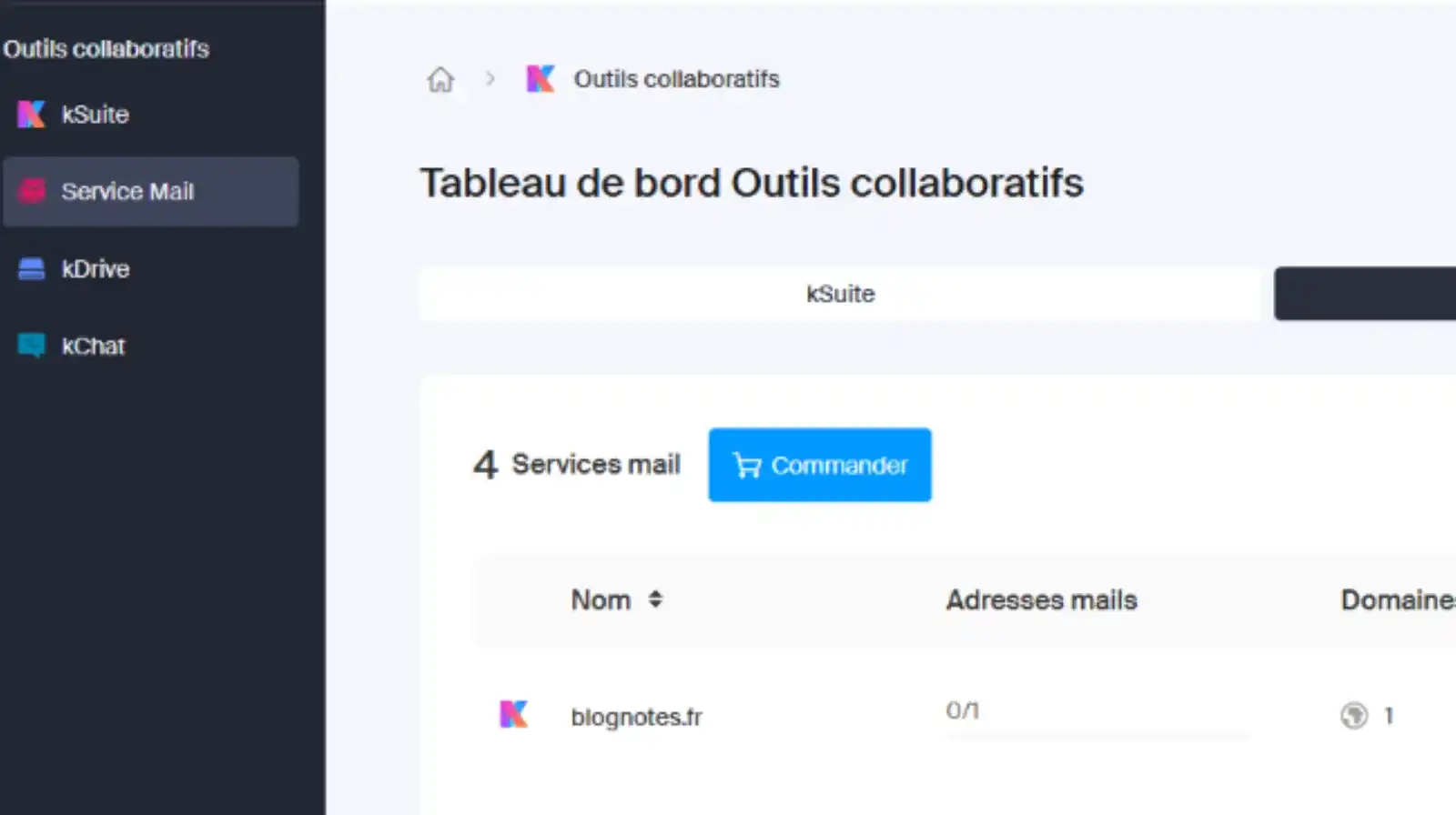 2. Puis Service Mail correspondant au NDD et cliquez sur ce dernier