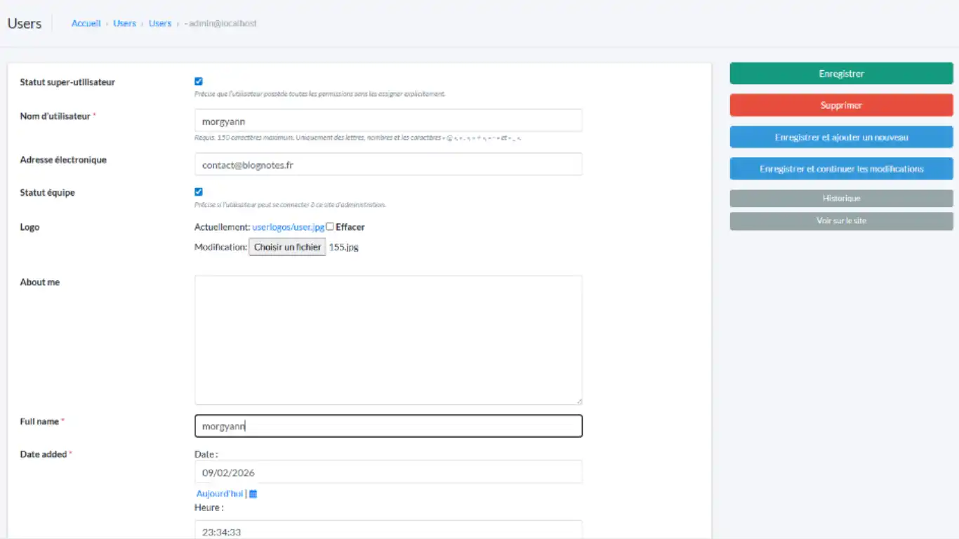 Sur la ligne de la liste des utilisateurs, cliquez sur admin et modifiez le pseudo, nom, adresse courriel et logo en Enregistrer