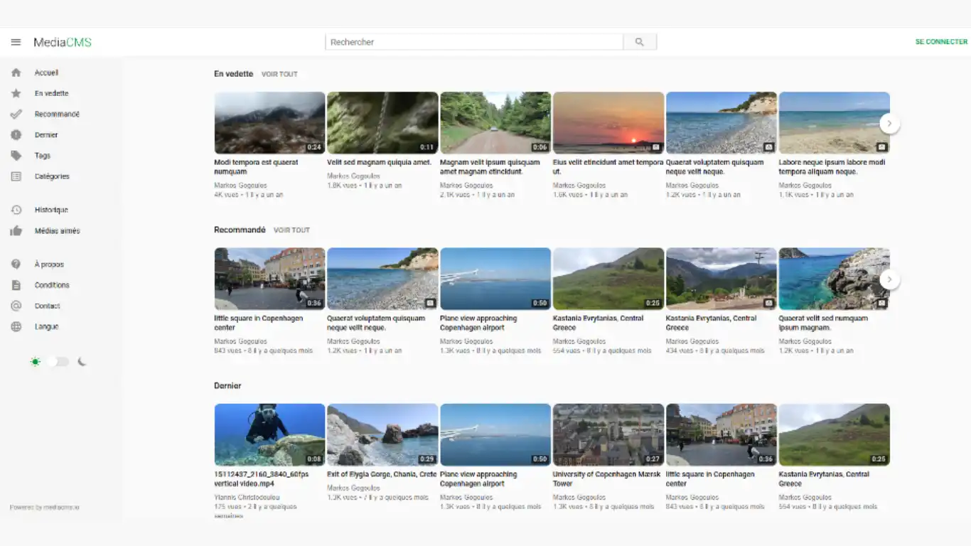 MediaCMS est un système de gestion de contenu (CMS) open source moderne et complet, conçu pour la visualisation et le partage de médias. Il permet de créer rapidement un portail vidéo et multimédia de petite à moyenne taille, similaire à YouTube, mais hébergé de manière autonome.