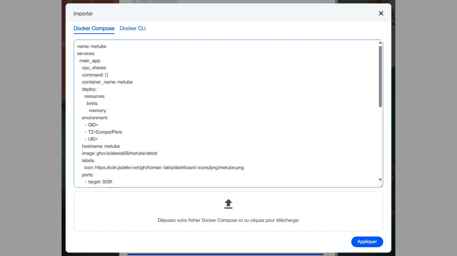1.3. Le pop-up vous propose d’importer votre configuration avec un fichier YAML ou de copier-coller celle-ci dans la fenêtre dédiée. Vous pouvez agrandir cette fenêtre en sélectionnant les deux traits en bas à droite.