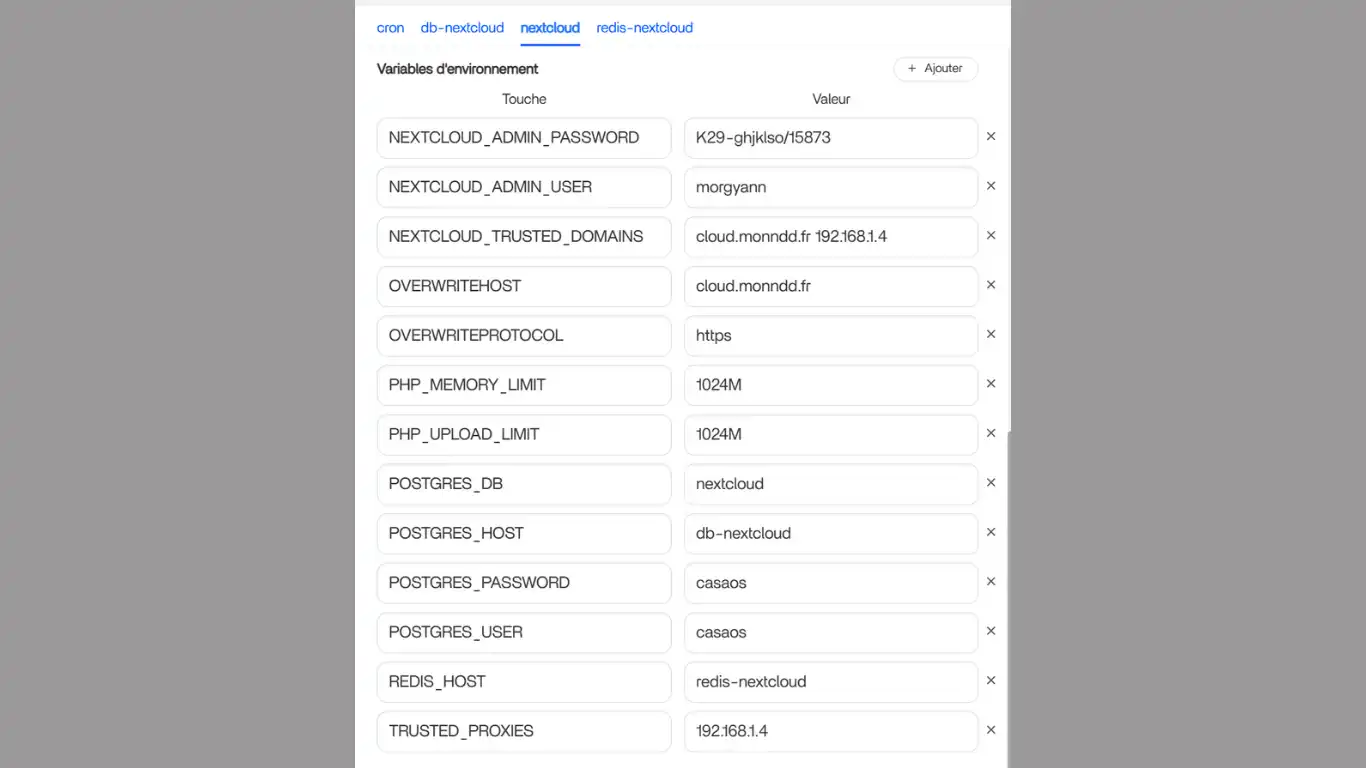 - NEXTCLOUD_ADMIN_PASSWORD = votre mot de passe de connexion (complexité moyenne au minimum)