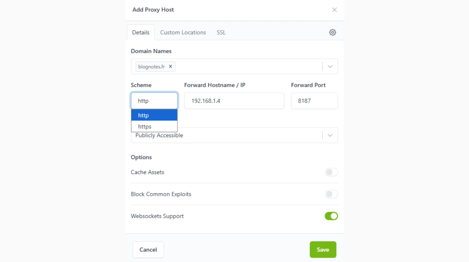 Dans la fenêtre Sheme si votre App, sur le réseau local, se connecte en HTTP, le plus général, ou sur un port HTTPS