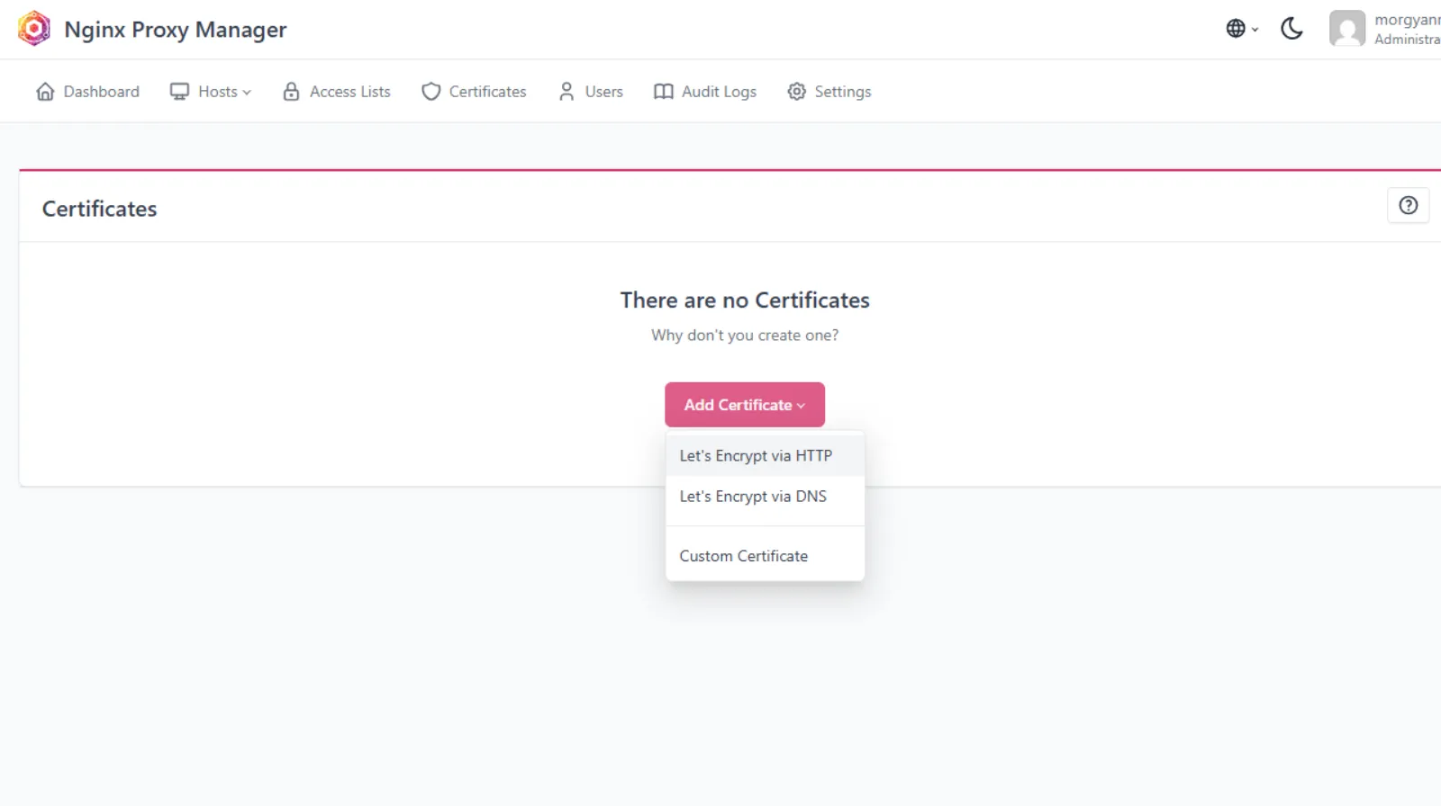 Cliquez sur l’onglet Certificates puis sur Add Certificate -> Let’s Encrypt via HTTP