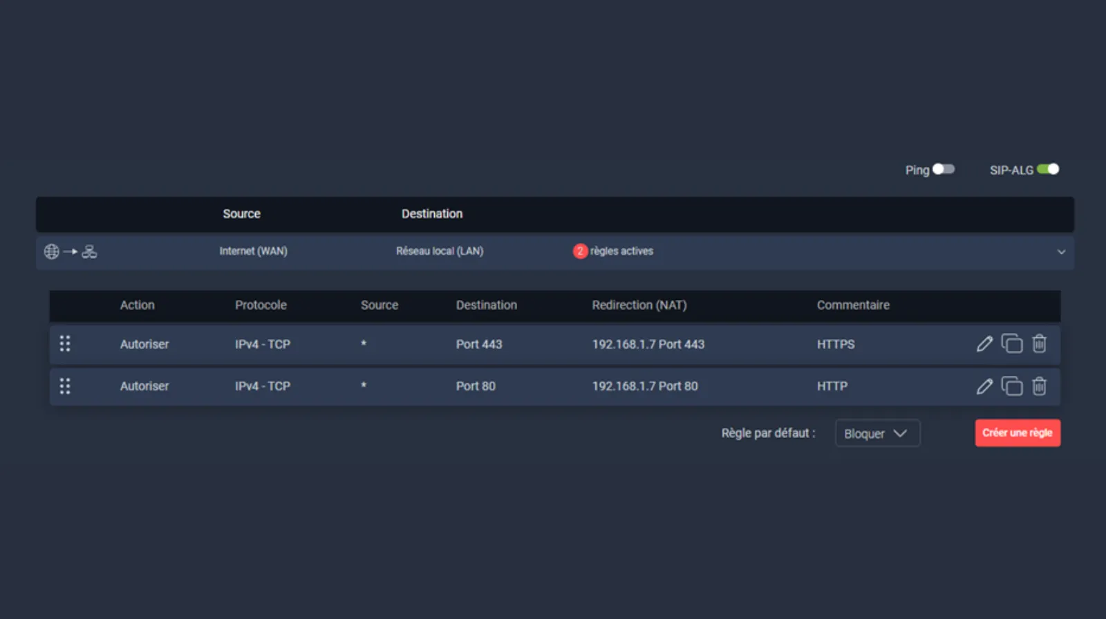 Ouvrez les ports 443 et 80 pour le serveur. L’onglet de la Box se nomme souvent NAT ou NAT/PAT ou Sécurité. Vous devez créer 2 lignes. Une première ligne sur l’adresse IP locale et/ou Nom du Serveur pour le port 80 interne et externe et une deuxième pour le port 443 interne et externe. Par exemple, sur l’illustration le serveur est à l’adresse locale 192.168.1.7 et sont ouverts les deux ports 443 et 80 en TCP. Concernant la fenêtre Source, laissez par défaut Toutes ou *