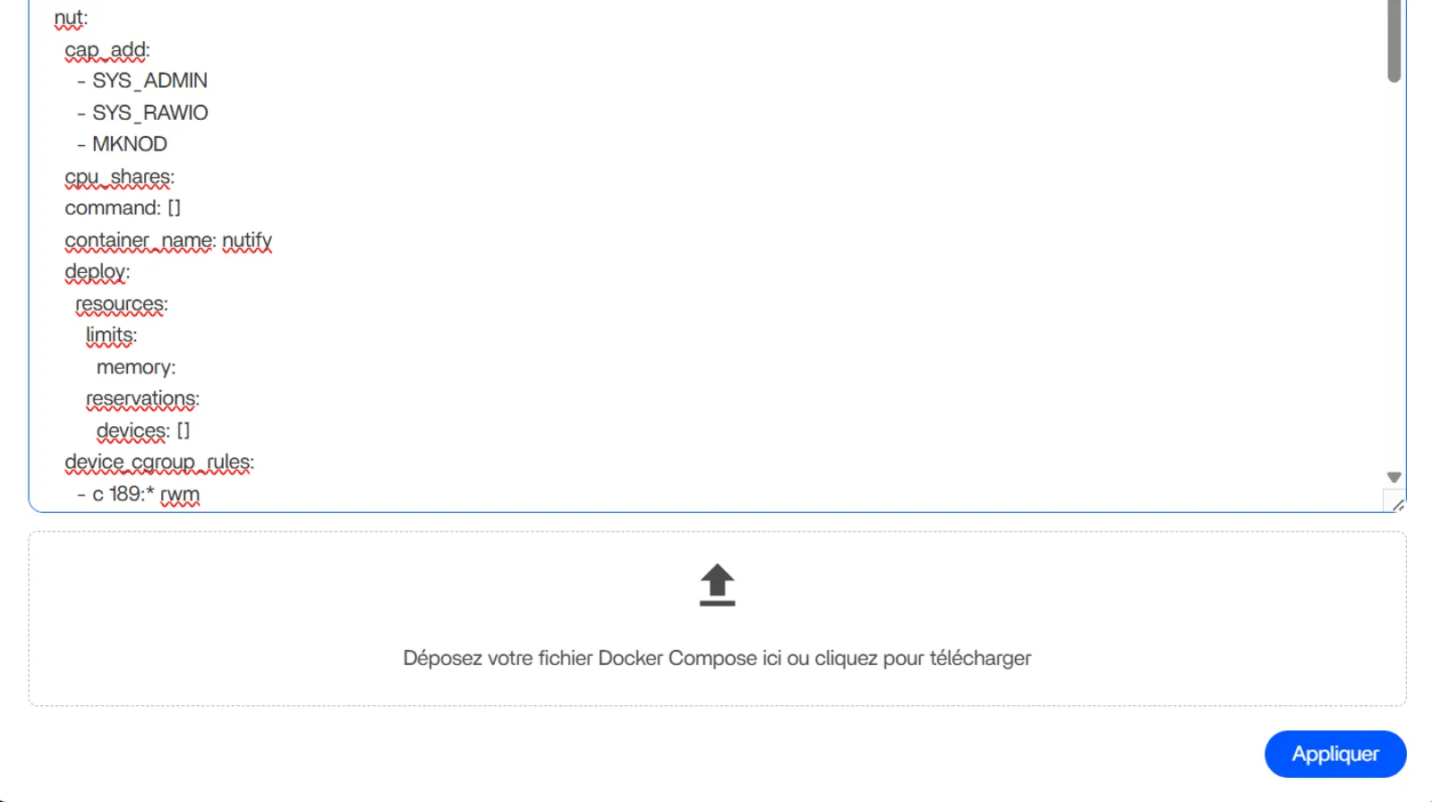 1.3. Le pop-up vous propose d’importer votre configuration avec un fichier YAML ou de copier-coller celle-ci dans la fenêtre dédiée. Vous pouvez agrandir cette fenêtre en sélectionnant les deux traits en bas à droite.