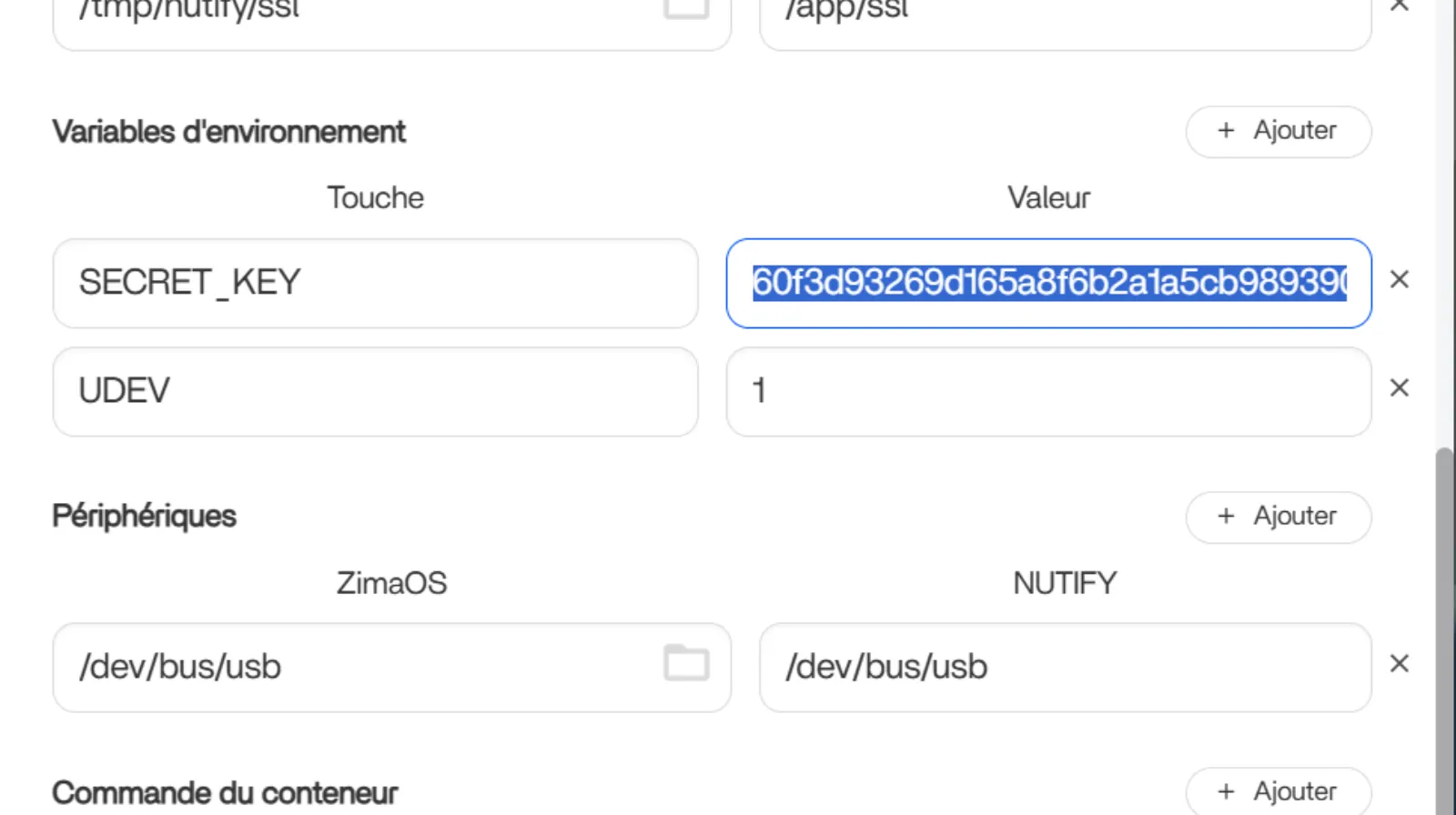 L’environnement SECRET_KEY pourra être changé après l’importation