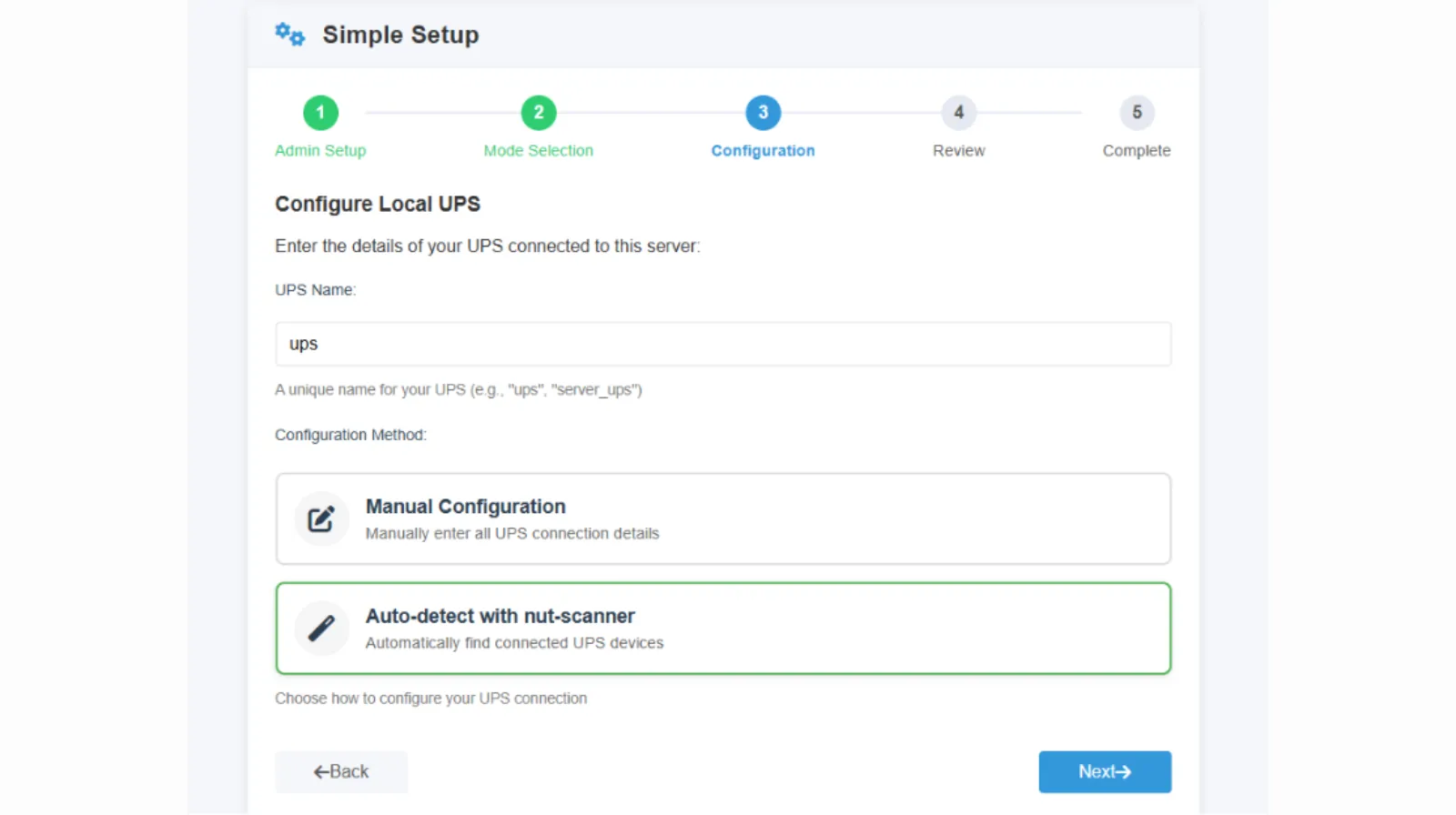 2.5. Choisissez la détection automatique de votre Onduleur UPS, dans le cas où il ne serait pas reconnu il vous faudra l’identifier manuellement. Puis, Next