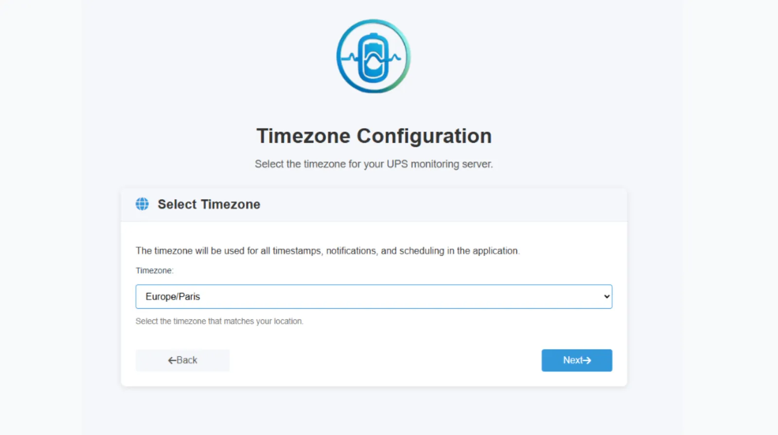 2.2. Sur la seconde page indiquez votre fuseau horaire à choisir dans la liste déroulante. Puis, Next