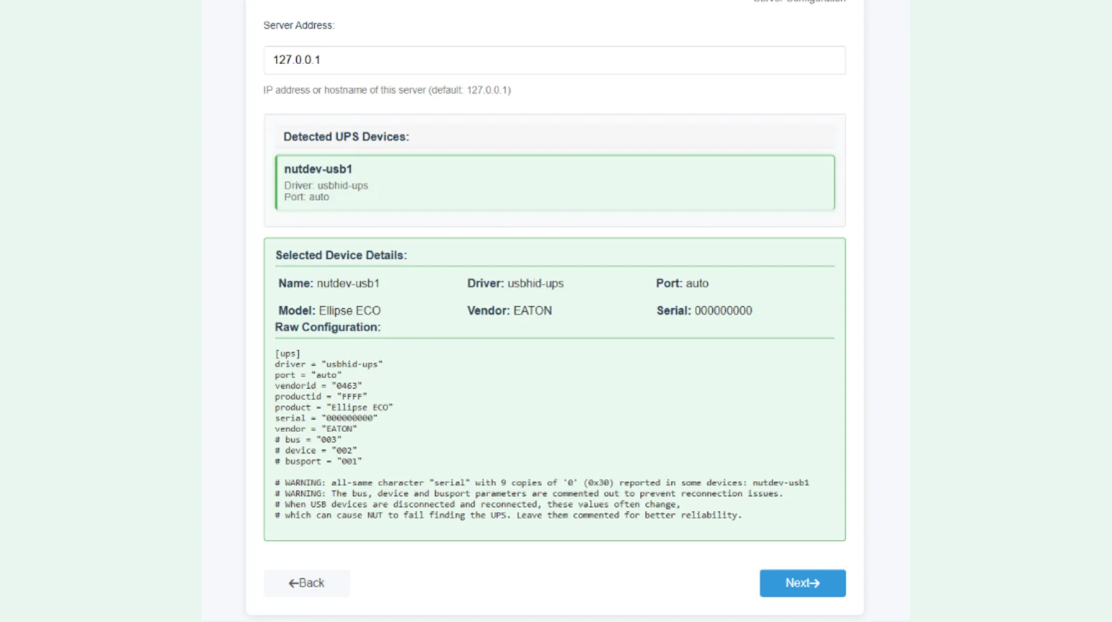 2.6. Dans la mesure où le modèle de votre onduleur fait partie de la grande liste répertoriée par l’application, le scan procédera à identification de l’UPS. Puis, Next