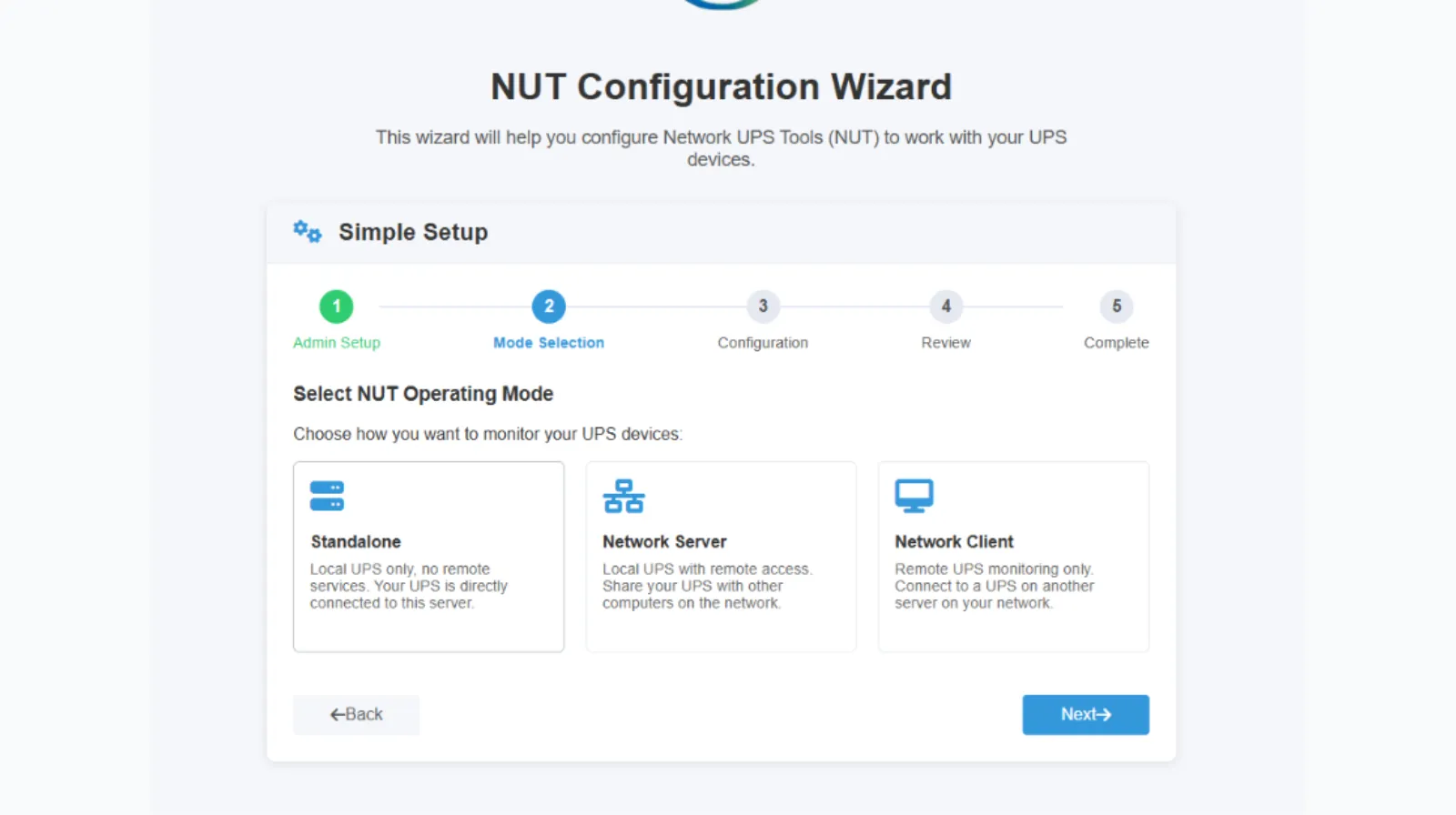 2.4. Choisissez le mode de connexion à votre onduleur le premier, dans une configuration classique par un branchement direct à votre serveur. Si vous avez plusieurs machines connectées à ce même UPS, deux autres modes sont proposés via le réseau ou en simple client d’un serveur NUT. Puis, Next