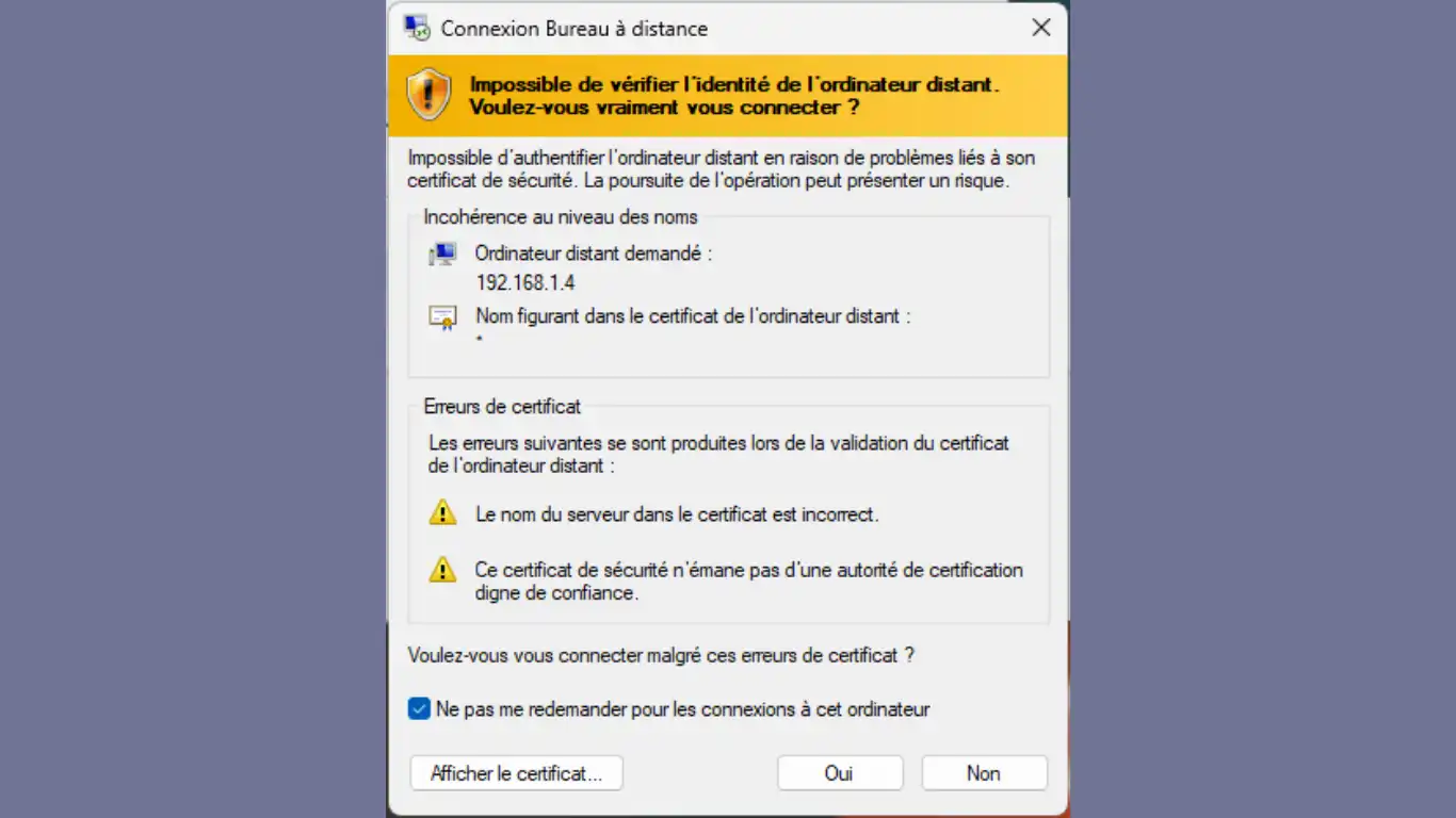 Sur la fenêtre signalant l'absence de certificat - cocher "ne pas me redemander + Oui