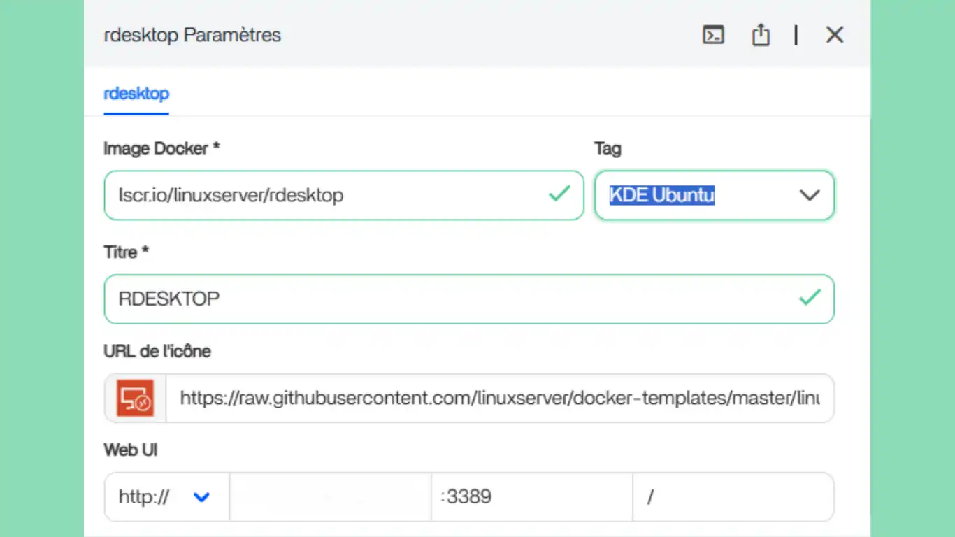 rdesktop est conçu pour offrir un environnement de bureau Ubuntu complet accessible via le protocole RDP (Remote Desktop Protocol). Ces conteneurs, principalement développés par linuxserver.io, permettent d'accéder à des interfaces graphiques Linux (comme XFCE, KDE, MATE, i3) depuis un client RDP (comme Windows, macOS ou Linux avec Remmina).