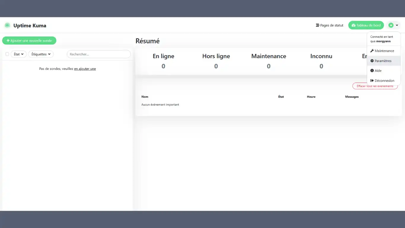 Vous pouvez créer une page de statut récapitulative des services web choisis - celle-ci peut être exposée en mode local ou exposée (sur un NDD dédié à Uptime Kuma).