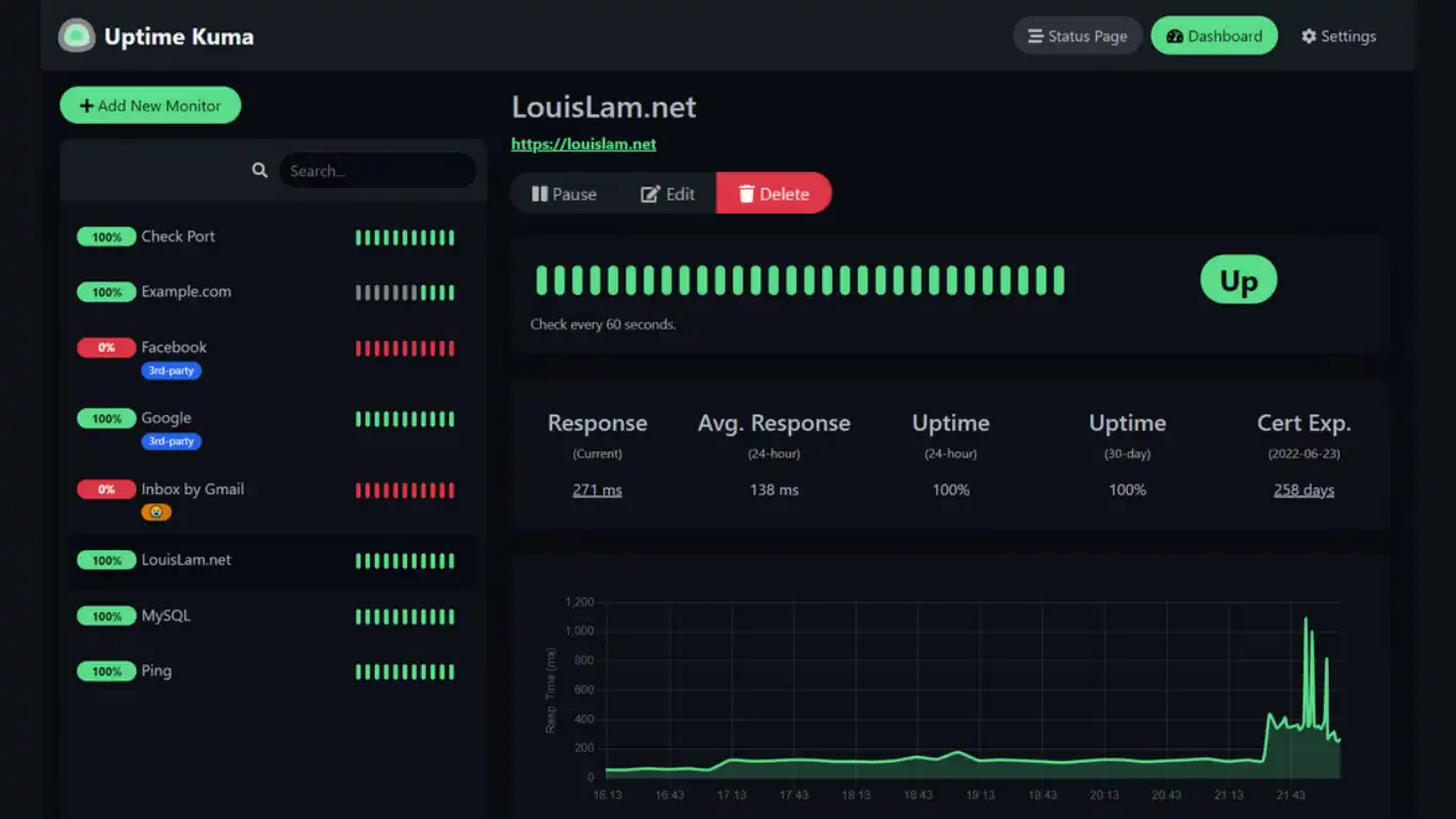Uptime Kuma est entièrement auto-hébergé, ce qui garantit un contrôle total sur vos données, une meilleure confidentialité et aucune dépendance à un service SaaS payant.