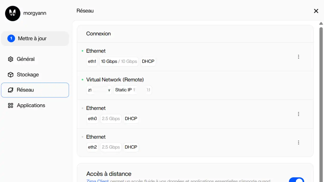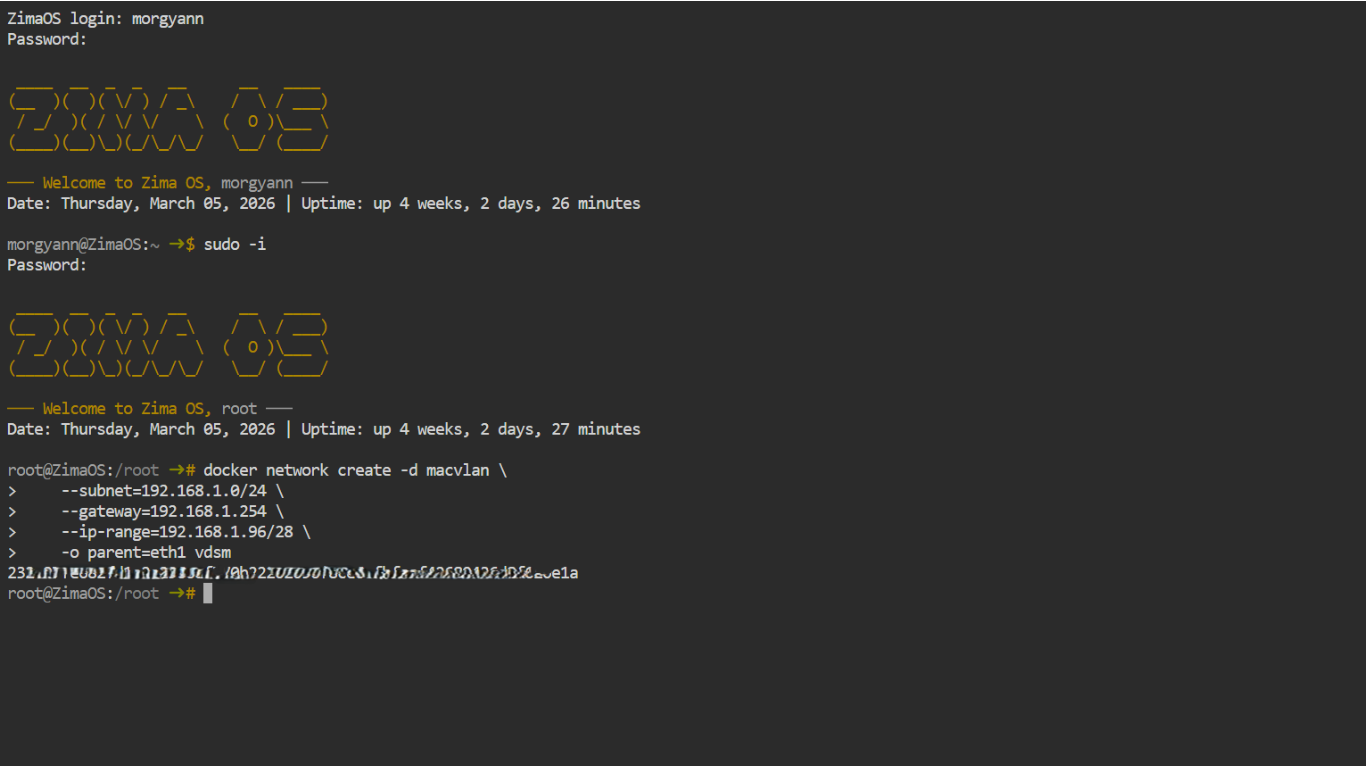 o parent=le port physique de la carte réseau connectée à la machine.Vous trouverez l'indication à l'onglet Réseau des Paramètres de votre ZimaOS (sur mon ex : eth1)