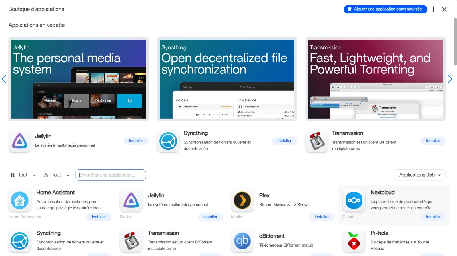 La Boutique d’applications propose à ce jour, 359 modèles d’applications préconfigurées et à installer en un clic. La fonctionnalité Ajouter ouvre la console de configuration vierge pour ajouter manuellement une application Docker. Le nombre de ces modèles d’applications pourra être considérablement augmenté par l’ajout des magasins d’applications tiers.